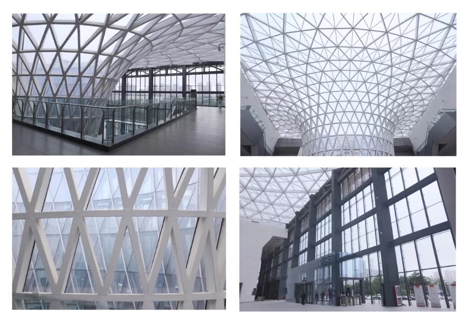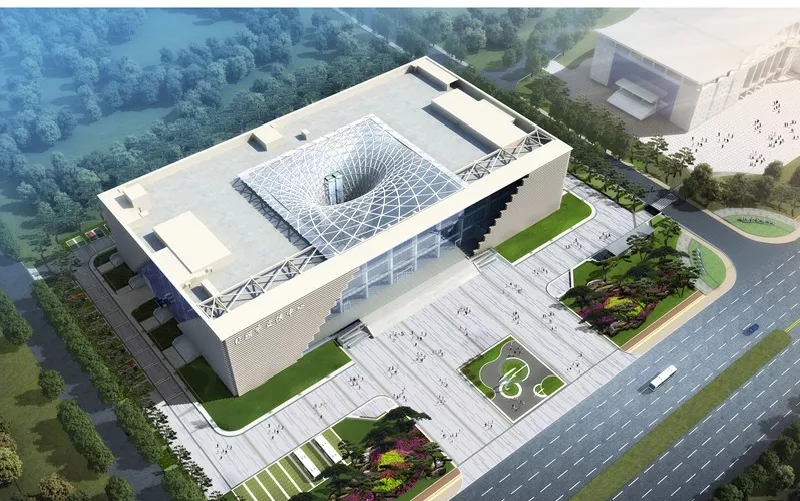 2.技術難點:本項目功能綜合,根據不同功能區人員密集程度不同,設計不同的快捷疏散通道,同時能體現出八大展廳功能布置的合理及規范。外立面系部圓弧采用條型金屬板實現,使轉角過度更加平滑;入口處采用鋼結構空間桁架滿足建筑大懸挑和造型的要求;躍層的大廳采用鋼結構玻璃頂,使之更加開敞明亮。